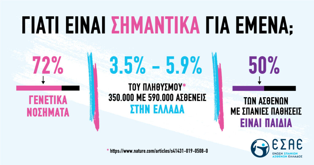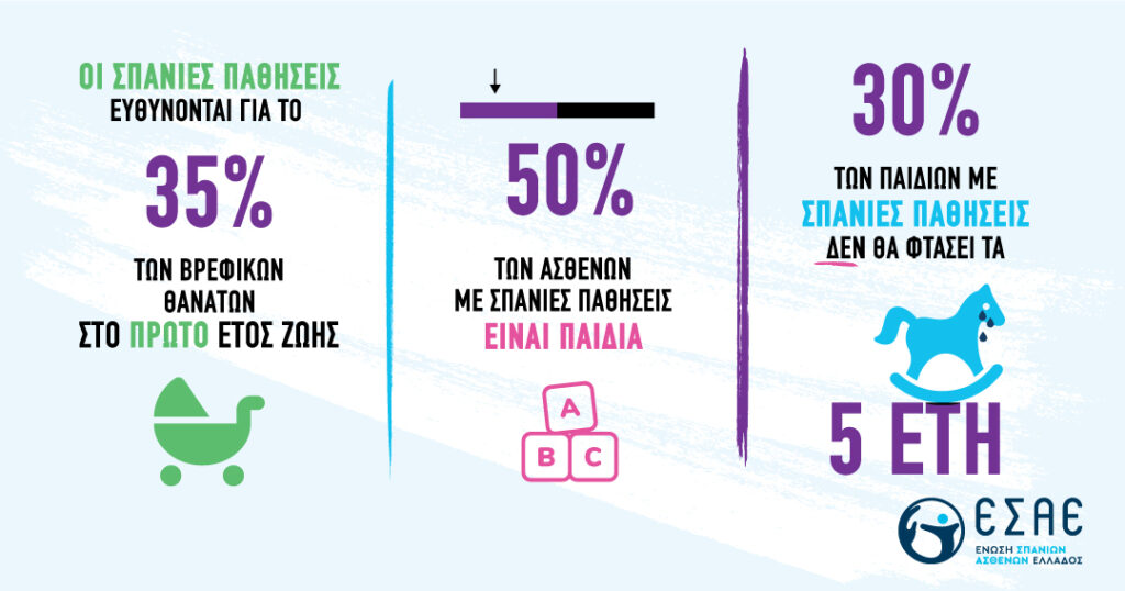 Το 50% των Σπάνιων Ασθενειών προσβάλλει παιδιά, με το 30% των παιδιών αυτών να πεθαίνει μέχρι την ηλικία των 5 ετών, ενώ υπολογίζεται πως σχεδόν το 50% των Σπάνιων Ασθενών είναι αδιάγνωστοι, ή παραμένουν για χρόνια με λανθασμένες διαγνώσεις, βιώνοντας μία μακροχρόνια «Διαγνωστική Οδύσσεια».